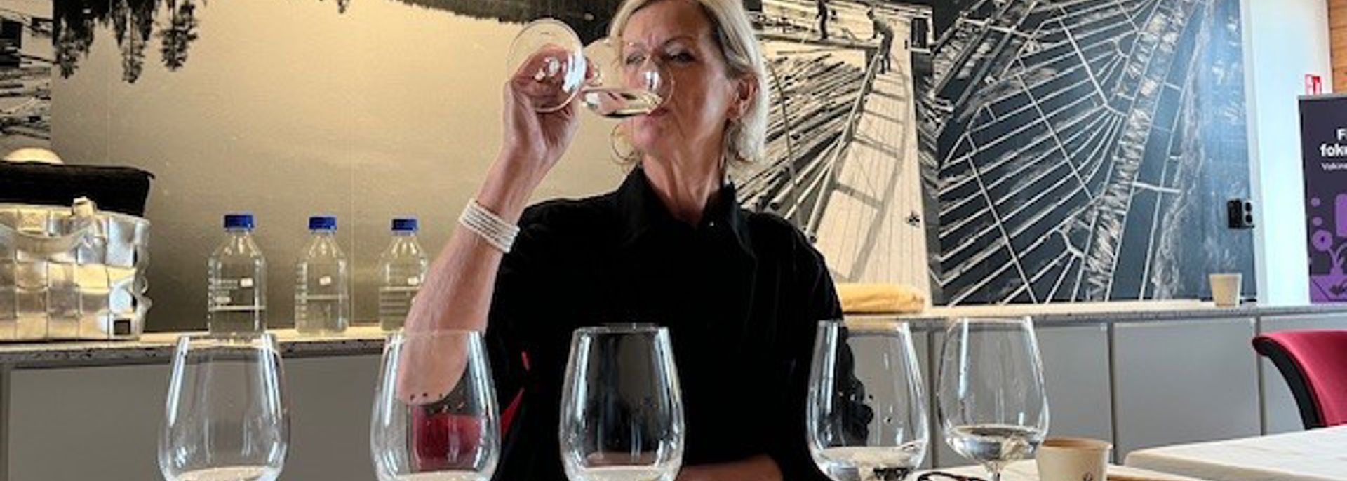 Bild: Juryns ordförande Gunilla Hultgren Karell smakar vatten på delfinalen i Umeå. Fotocred: Svenskt Vatten