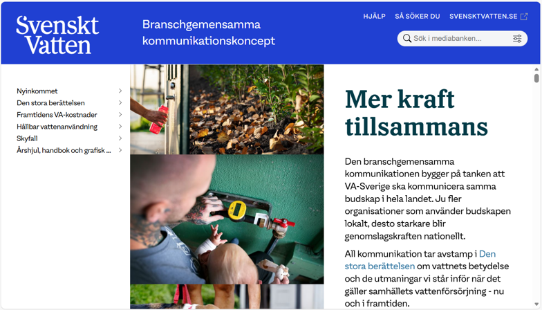 Med en gemensam röst blir vi starkare. Därför har vi utvecklat kompletta kommunikationskoncept för medlemsorganisationer att använda i sina egna kanaler. Koncepten utgår från Den stora berättelsen om vattnets betydelse och de utmaningar vi gemensamt möter. De tre koncepten är framtagna i arbetsgrupper med representanter från VA-organisationer och Svenskt Vatten:
