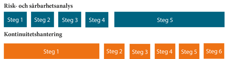 Skillnaden mellan de olika processerna illustreras av ovanstående figur. De fyra första stegen i arbetet med risk- och sårbarhetsanalyser motsvaras av steg 1 i kontinuitetshanteringen. Steg 5 i risk- och sårbarhetsanalysen motsvaras av steg 2-6 i kontinuitetshanteringsarbete (Risk- och sårbarhetsanalys och kontinuitetsplanering, likheter och skillnader, Krisberedskapsmyndigheten, november 2007).