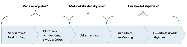 Säkerhetsskyddsanalysen ska svara på de frågor som beskrivs i illustrationen nedan och i följande text.
